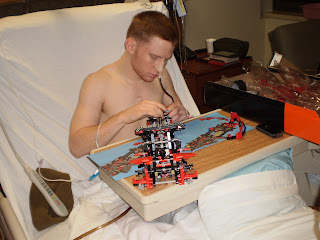 This time in the hospital has been excruciatingly boring (since we don't have to eat three times a day, that's a lot of time on our hands). Because of the tube, Seth isn't mobile, but, unlike last time in the hospital, he doesn't need to sleep all the time and he's not on heavy doses of pain medication. Our occupational therapist came to the rescue on Tuesday with an amazing Lego kit--the kind that requires a lot of time and patience to complete. We were both grateful--one can only watch so much of Parolees and Pitbulls.